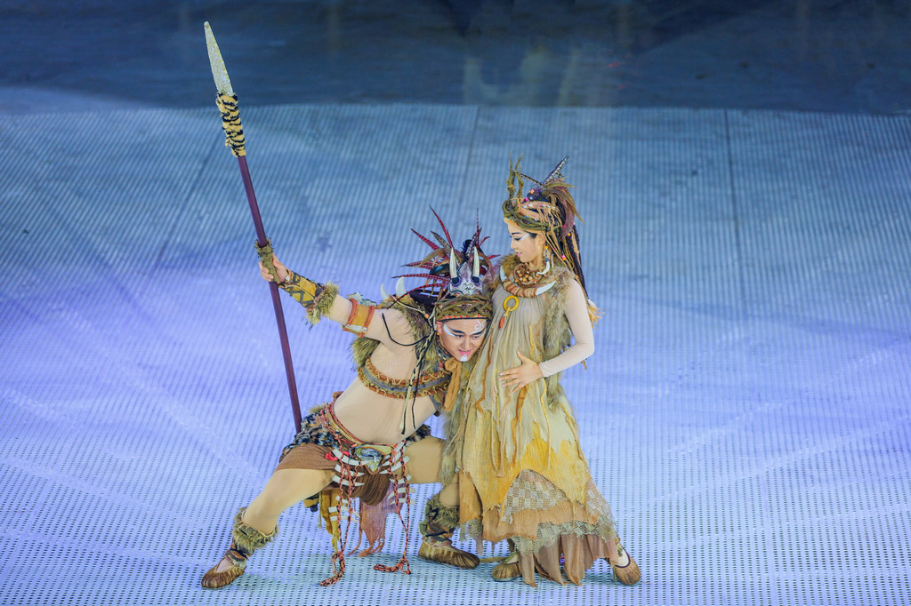 一群古“建德人”手持短棍和长刺游弋花海,一堆篝火慢慢点亮,映亮火旁一男一女,首领装束的男人搂着自己处于孕期的女人呢呢喃喃,人们渐渐将他们环在中间,直到婴儿的出世,众人再次围着两位首领舞蹈庆祝。