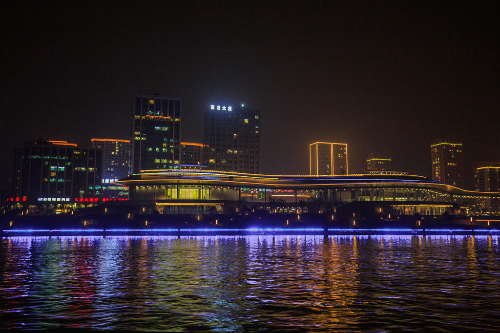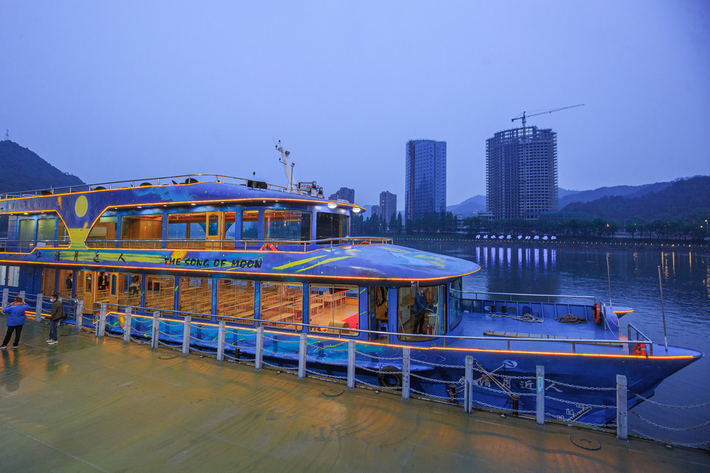 乘坐大型游船前往坐落在江心的月亮岛的途中,一路上穿越了一座座的跨江大桥,新安江两岸的美丽风光,五彩缤纷的霓虹灯稍纵即逝。