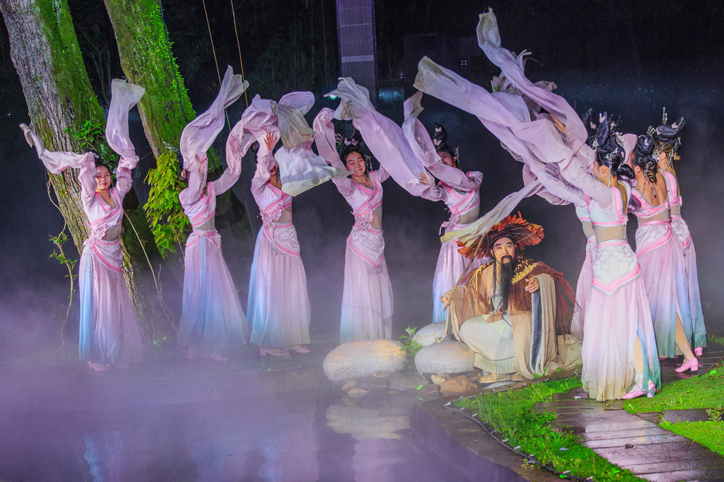 最后严子陵跟随着翩翩起舞的仙子们隐秘于山林间,而远山的首领再次出现引领大家千万下一幕观看演出。