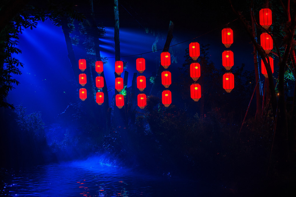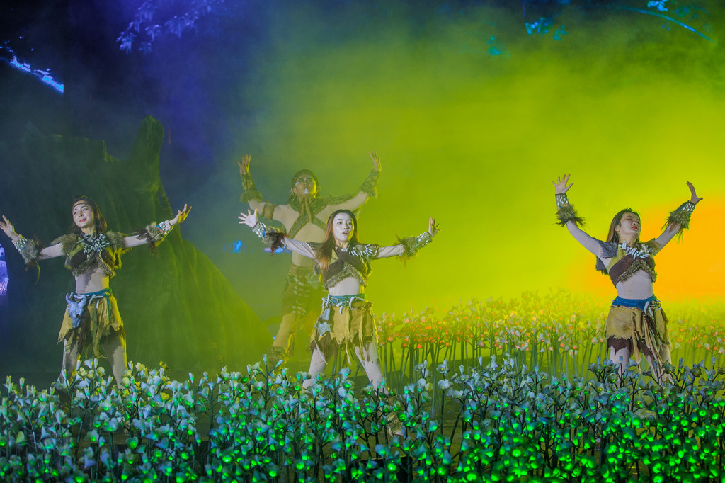 跟随着引路人(船上的老渔翁和孙女)的声音和指示牌前往第一演区。虽然路上比较黑,好在每段台阶或者观看区都有工作人员打着手电细致引导,待到游客差不多到齐观演区后,灯光骤然全暗,一阵春雷响过,完全由LED灯组构成的花儿流水般依次开放,渐渐映入眼前的是一片美到极致的五彩花海。一系列虚实交融的画面展示在游客眼前,呈现一段活灵活现的“逐鹿之境”。