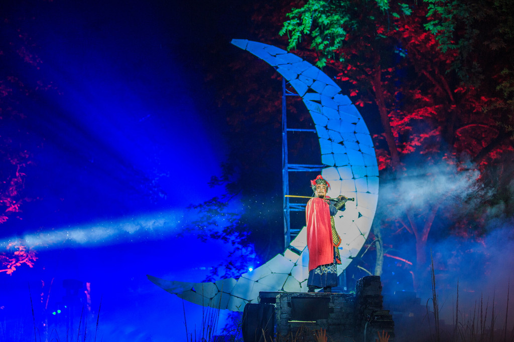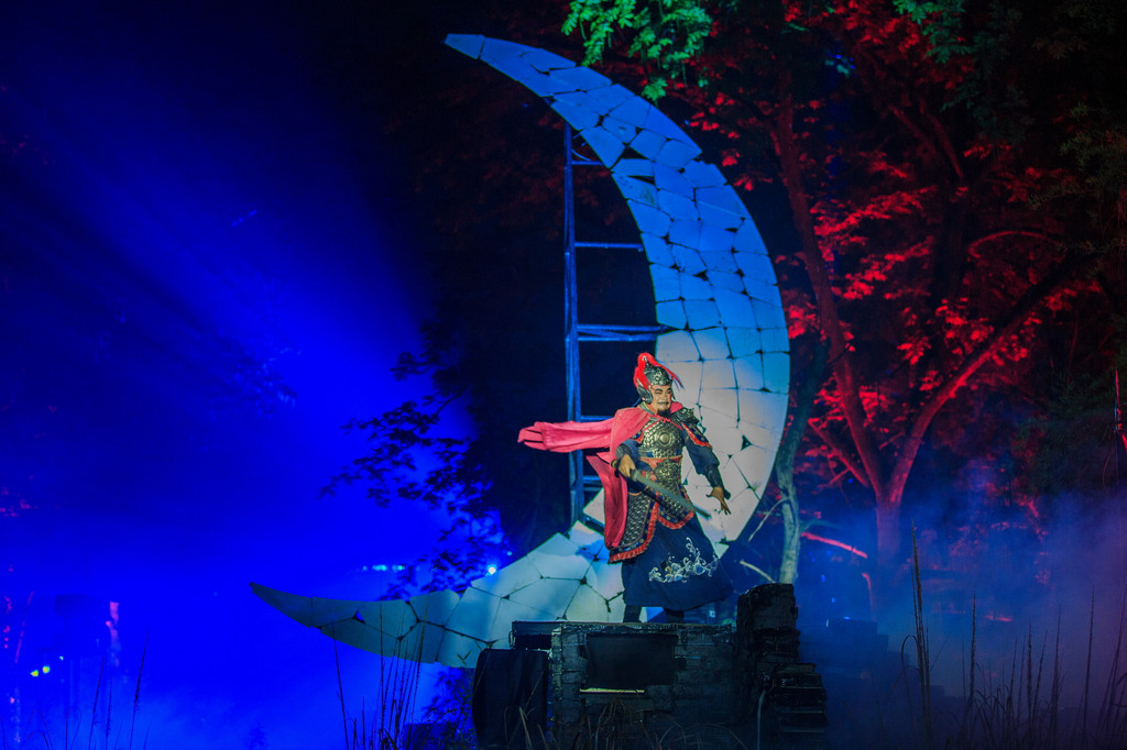 不远处雄浑的和声响彻天地:移舟泊烟渚,日暮客愁新。野旷天低树,江清月近人……在山顶大大的圆月上,孟浩然与李白再次举杯起舞,当然我们熟悉的一群“建德人”再次出现引领大家前往下一幕。
