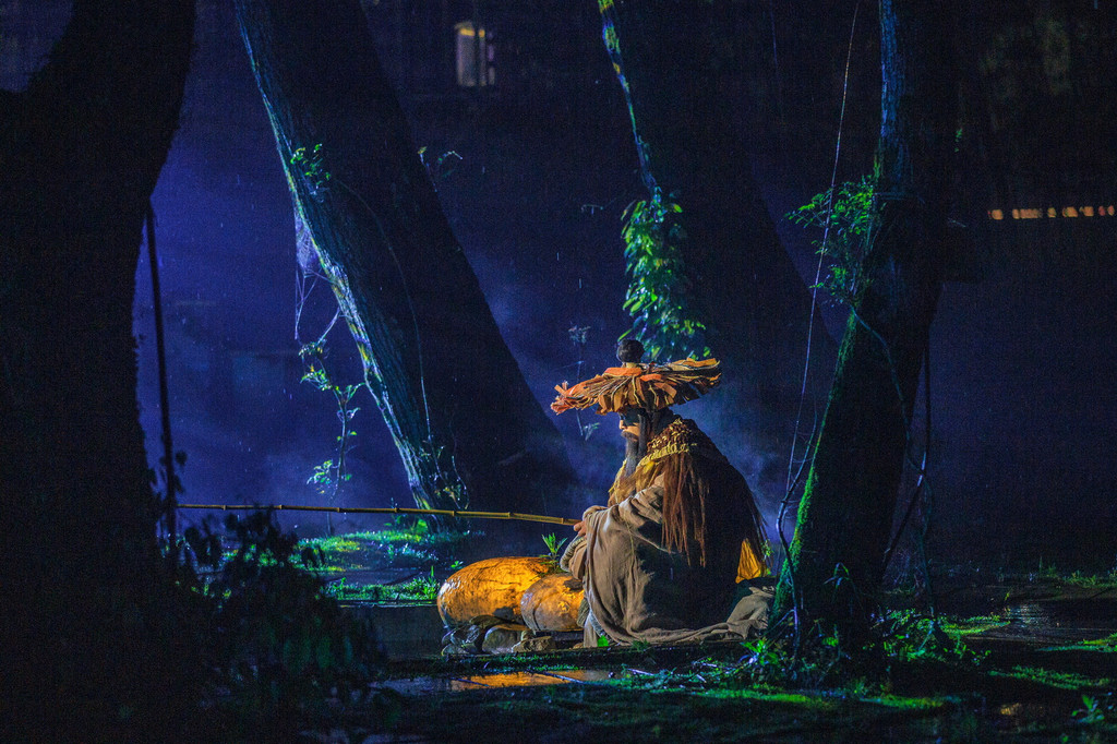 “建德人”首领肩扛长长的钓竿踽踽独行,突然一道雨帘瞬间出现在观众视野里,当他穿过厚厚的雨帘后,已经变身为斗笠蓑衣的汉代名仕严子陵,身后有洗衣做饭的村民以及牵着牧牛的老农,刻画了一种与世无争的世外桃源般的生活。