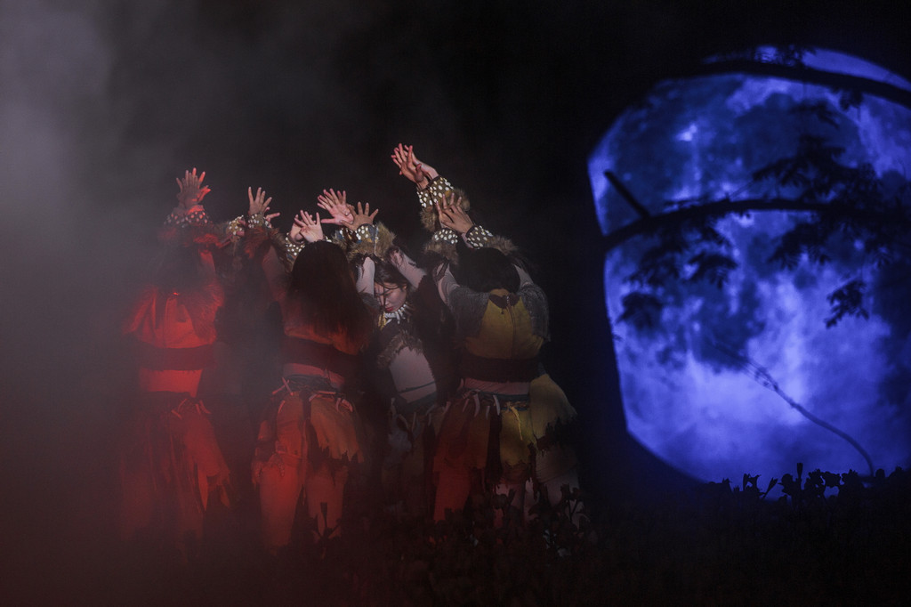 当水系统将舞台水抽干后,圆形舞台上投影出巨大的月亮元素画面,映照圆满的结局。而“月”也顺利成章的成为整个演出中贯穿始终的情感表达者,演出五幕分别采用五种不同技术手段呈现了五个不同的月亮——新安江之月、唐诗之月、生命轮回之月、根脉归心之月、前世今生之月等多层表意,进而烘托出了“烟渚千年事,江月万古情!”所凝练的主题表达。