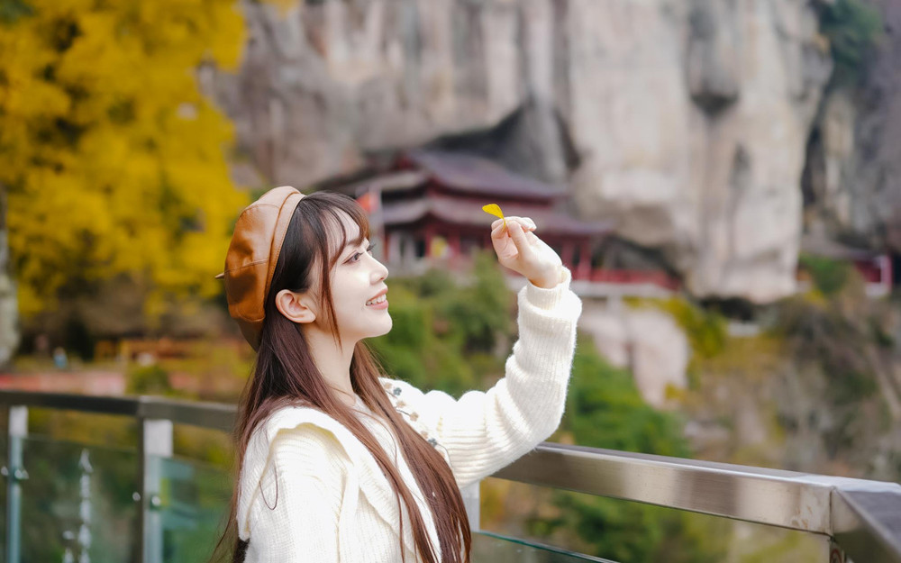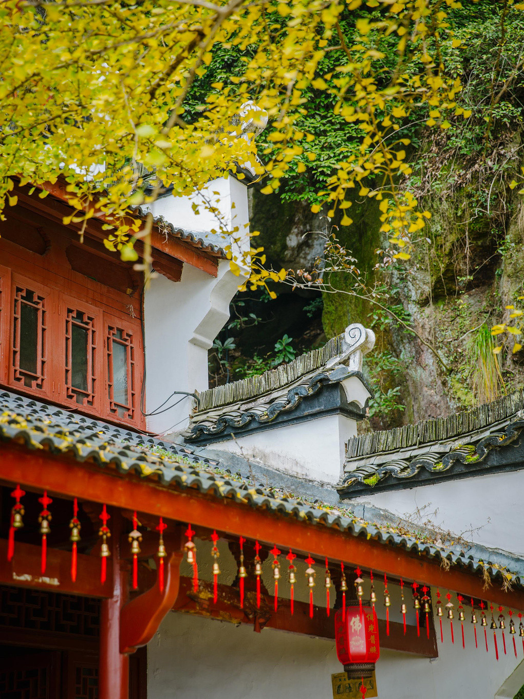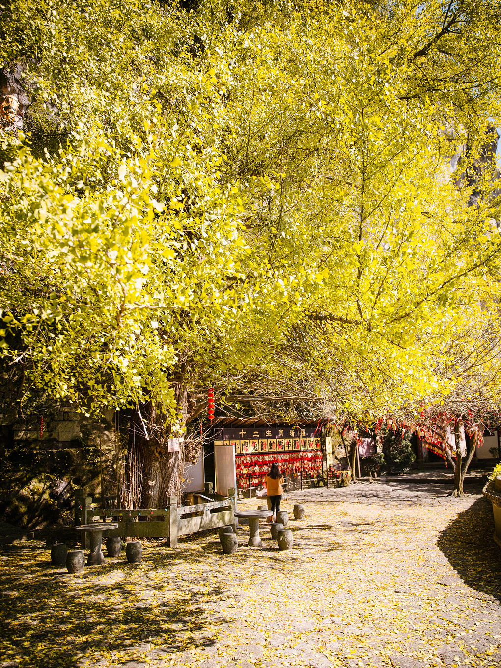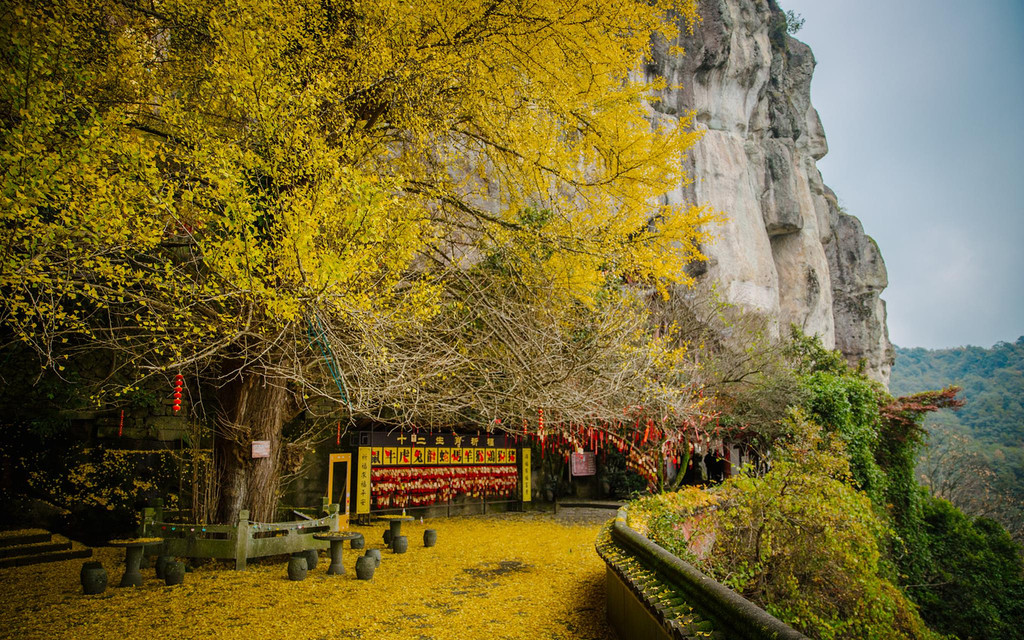 在大慈岩遇到的每一棵古树,每一道山峰,每一座角亭,每一缕佛香似乎都透着灵韵,若是有一番好兴致,还可以去这里的千年银杏王观赏一番,仿佛一夜之间,黄叶飘零遍地金,当漫天黄叶和一地碎金进入眼中,心中的秋意也一半成诗,一半成信,留存了一整个秋天。