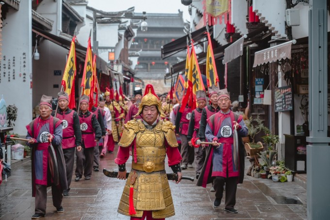 上午10点, 三江 口畔,澄清门下,敲锣打鼓,热闹非凡,身着古装的士兵们一字排开,舞者以柔美舞姿欢迎八方来客。万仞城墙下,开门迎宾朋,随着一声“开城”,在仪仗队伍和表演队伍的陪同下,“严州知府”邀宾朋走进古街,共览严州盛景。