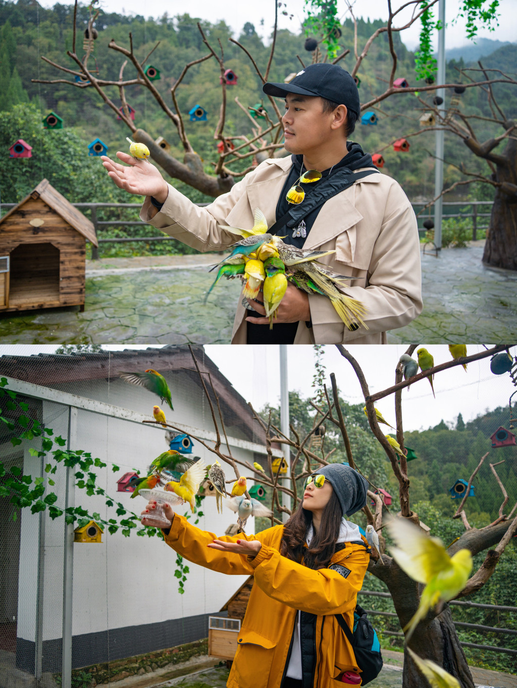 沿右侧道路前行,便抵达了孔雀园,刚开始以为是在栅栏外观赏,谁知道这是可以走进去亲手投喂的,能收获非常精彩的孔雀照片,还有可爱的可达鸭可以撸。哦对了,记得买点零食,一大群鹦鹉们飞奔而来,在你身边,头顶,手边环绕飞行,这感觉太梦幻了。