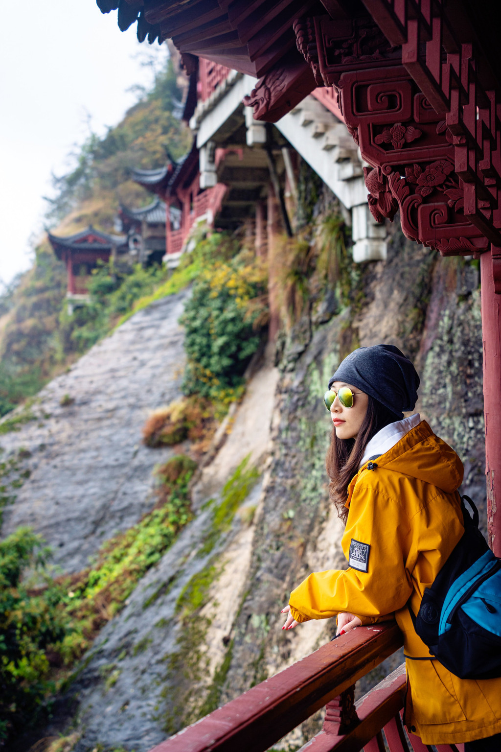 第一站是著名的江南悬空寺,它的建造非常讲究力学原理,在当时亦是颇具挑战性的工程。但见寺庙半嵌入岩壁中,另一半则是以木柱悬空构造而成,站在平台上,你无法感受到它的险峻,但是从侧面来看,你会发现它的壮观和惊险之处,不禁让人心生敬畏。这里与山西恒山悬空寺有异曲同工之妙,被共称为“中国南北悬空寺”。