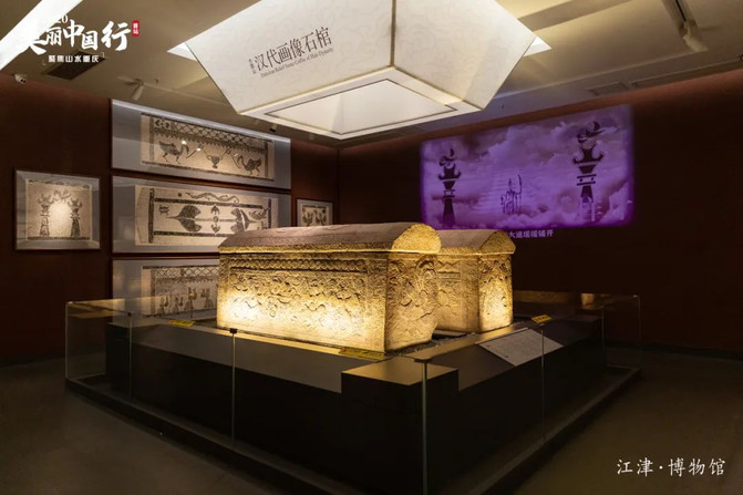 在博物馆展陈里最有代表性的,当属汉代画像石棺。两口石棺出土于江津区油溪镇一处东汉墓葬群,距今已有2000余年。