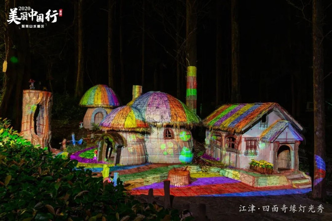 四面山用光影编织出了一个浪漫又酷炫的科技乐园。在这里你可以用眼睛看,用耳朵听,身临其境走进这五彩斑斓的奇幻世界里。“四面奇缘”是四面山望乡台景区夜游景色中最重要的一部分。望乡台景区夜游东线总长1.2KM,夜游时长约2.5小时。