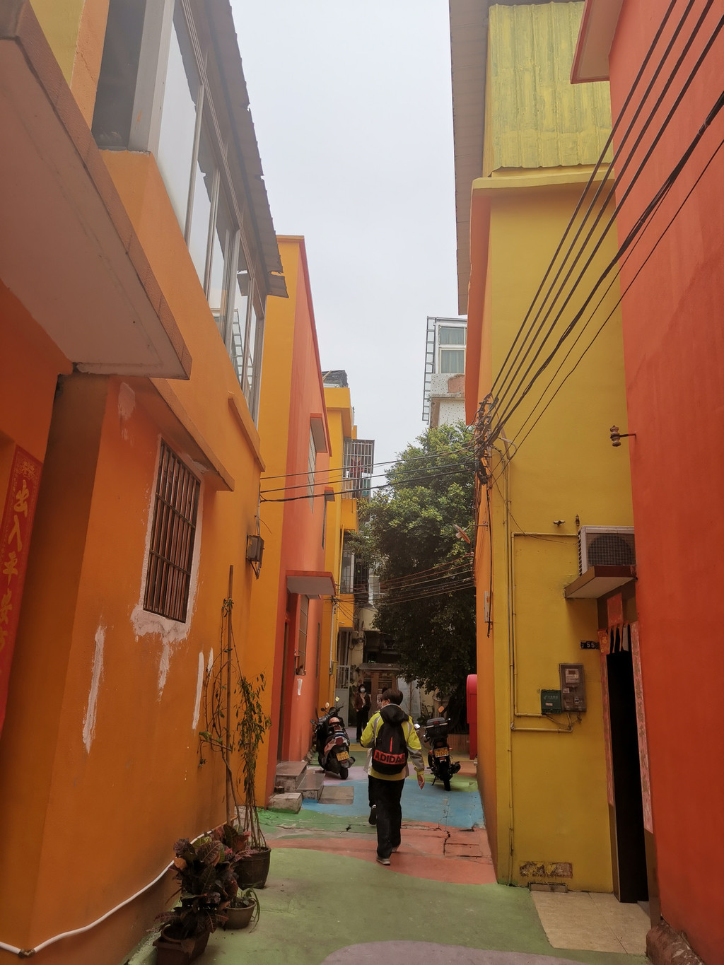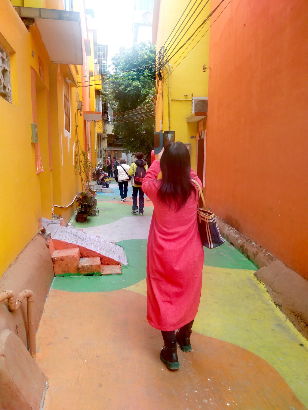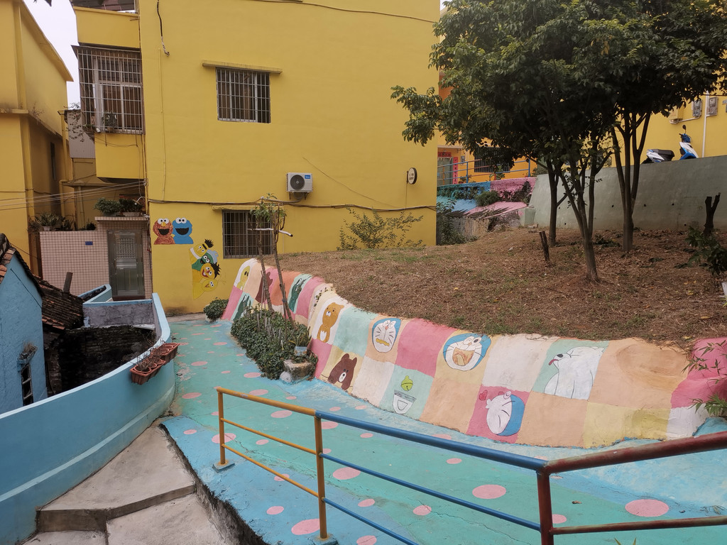 彩虹村,除了墙身粉刷的彩色外,特色小店并不多见。不过你想喝杯水还是有的,没有任何文化意蕴,江门特色的文化丝毫没有体现,也没有多少艺术的氛围。刷了个墙壁,就想成为景点,未免有招摇撞骗之感。改天把我住的这个小区的几栋楼房的外墙涂成五颜六色的,是不是可以称为彩虹区?或者我把家里客厅的墙刷成黄色,书房的墙刷成紫色,卧室刷成浅蓝色,是不是可以称之为彩虹家?