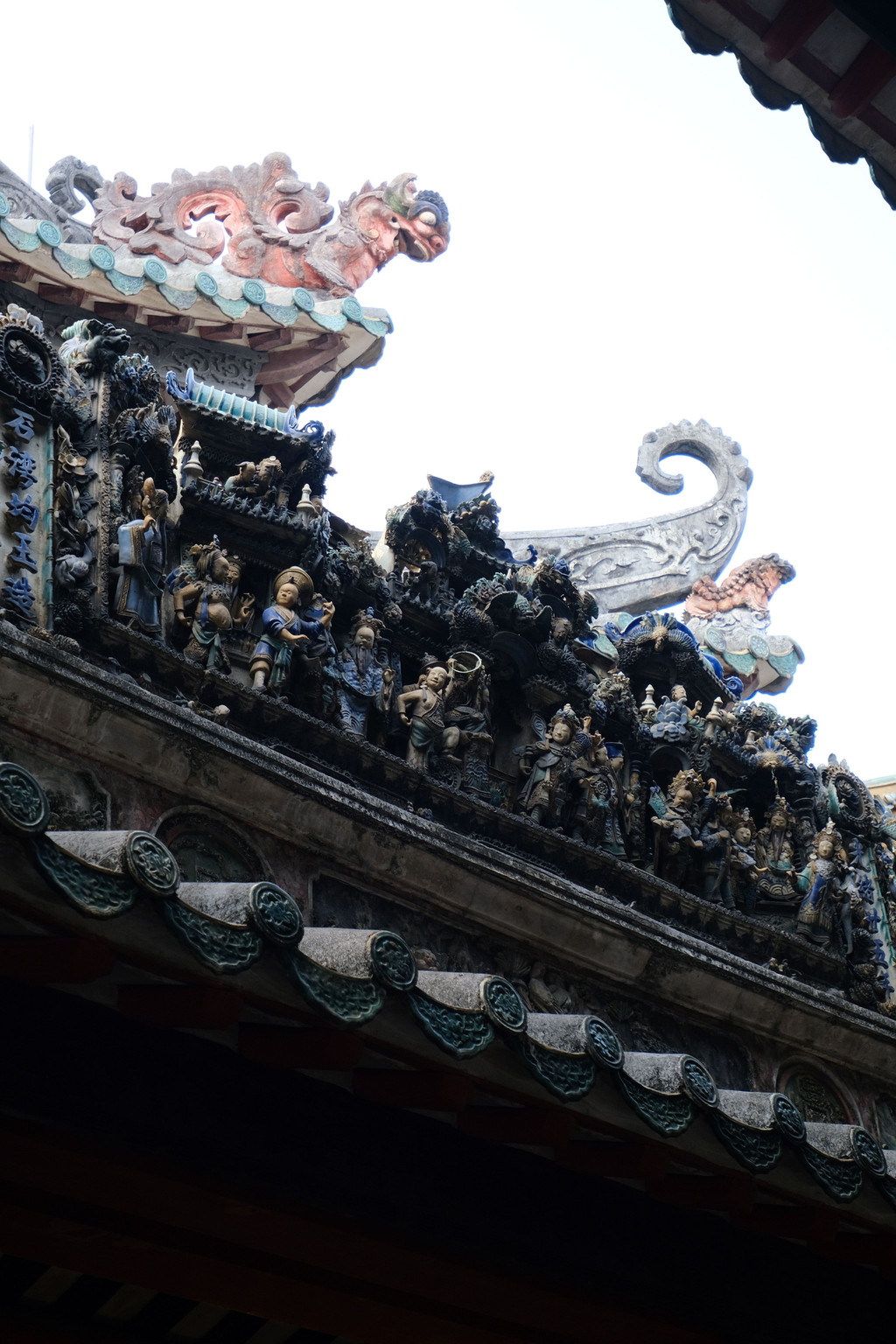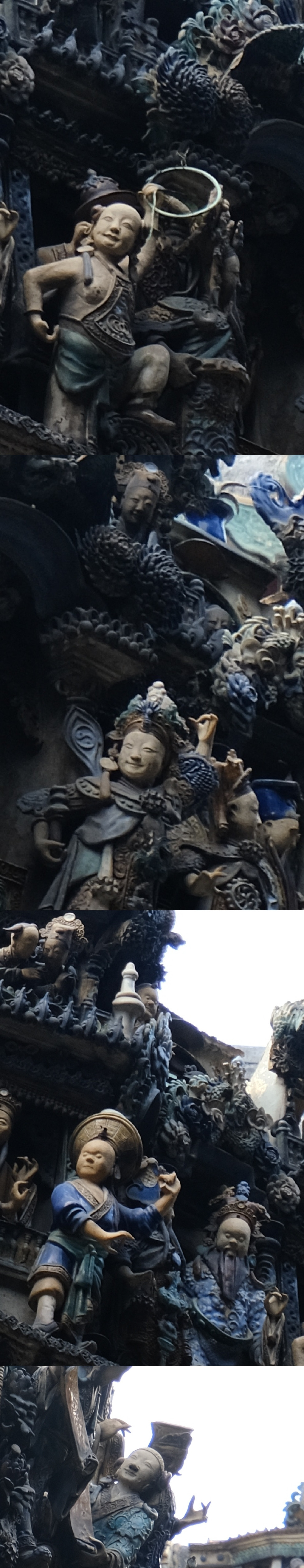 走进“灵应祠”,这里供奉的是北帝,无论是建筑还是装饰,岭南文化都特别鲜明。有攻略说来佛山祖庙一定要多抬头看,一抬头真的会被房子的屋顶震撼到。这是一种石湾陶塑的技艺,屋顶上有花草人物、飞禽走兽,堆叠在一起,一层一层好不热闹。除了好看的屋顶,祖庙里还有各种精美的砖雕灰雕木雕石雕,值得你细细品鉴欣赏。