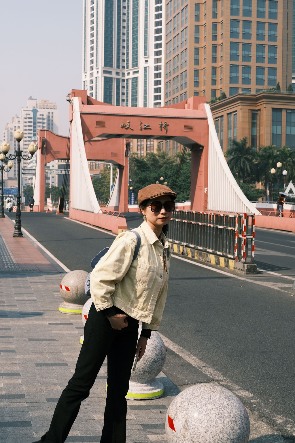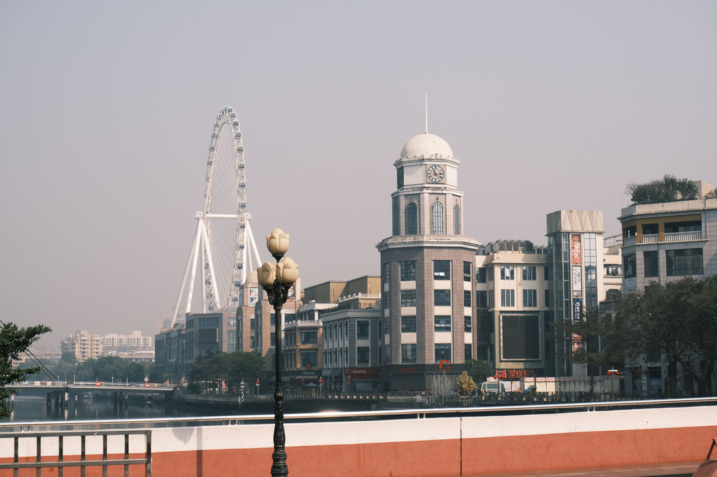 从地下车库一出来,就看到了光明桥,边上就是一个巨大的摩天轮。再往前走一点就是岐江桥和码头,这座粉红色的桥梁是一座可开合的桥,挺有意思。码头边还有孙中山先生的雕像。