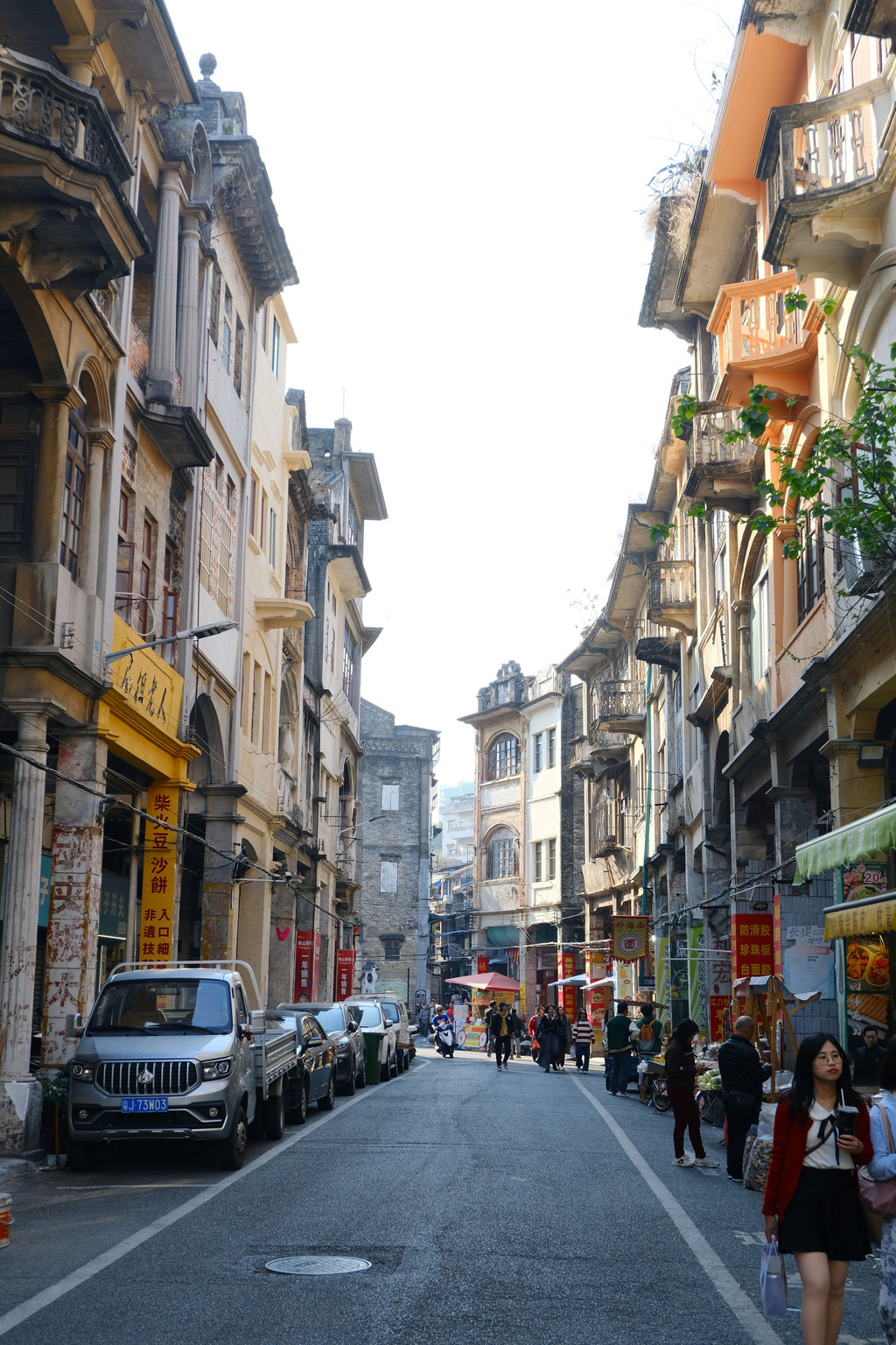 下午我们前往启明里和三十三墟逛逛,今天周日,停车位不太好找,最后停在了蓬江大桥下。我们从启明里穿过一个农贸市场,来到了三十三墟。这里都是南洋的骑楼建筑,房子都很有年代感,整体是八九十年代的味道。