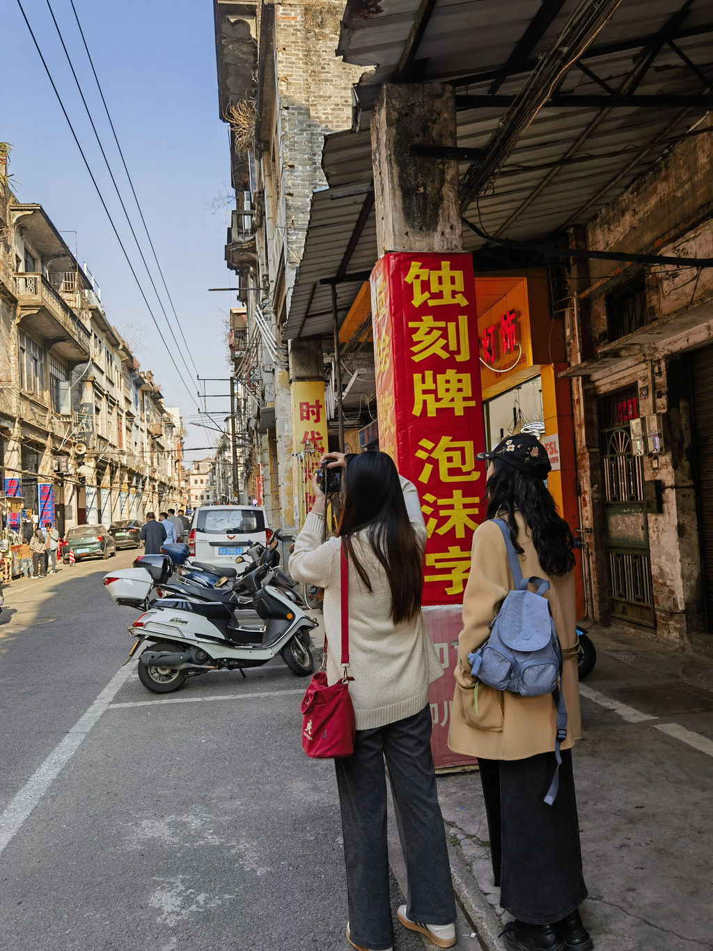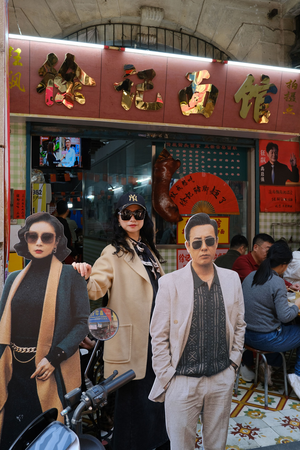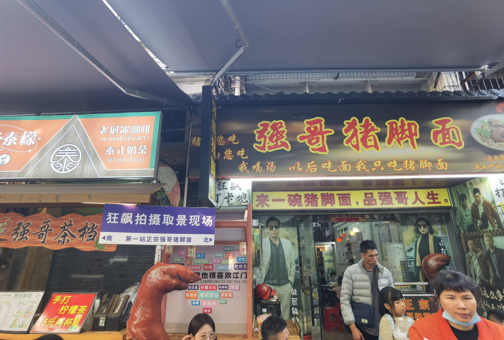 一部电视剧《狂飙》带火了这里,到处可见电视剧的元素,还贴心的有电视剧同款取景地提示,甚至于还有志愿者帮忙指引。但是这一片目前主要是农贸市场,店铺、临时摊贩、车辆、行人、游客交错其中,非常混乱,目测一下,猪脚面、新会陈皮和奶茶店是最多的。我们跟着墙上的指引,找到了四五个影视剧打卡地,那就拍照留念吧。