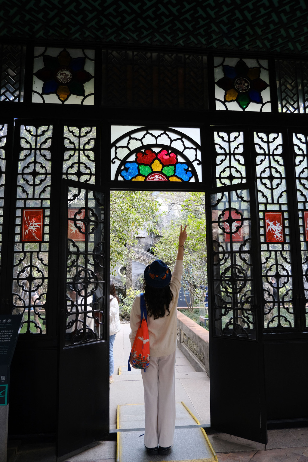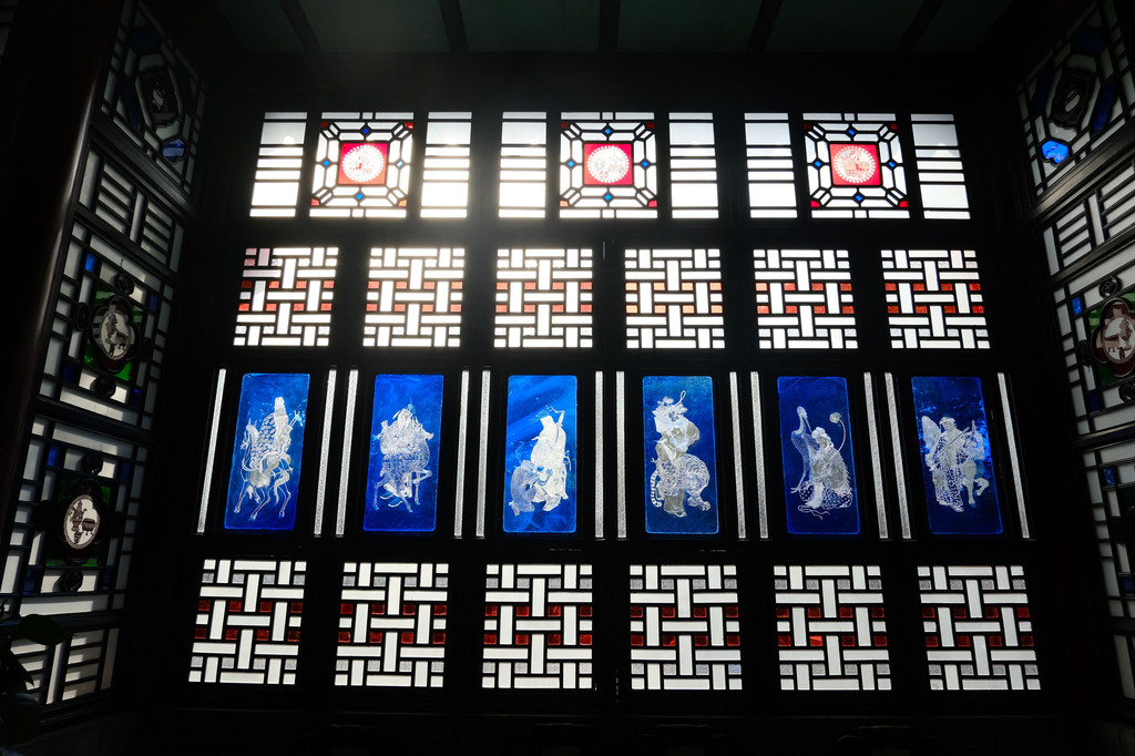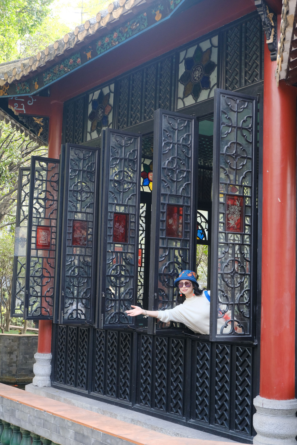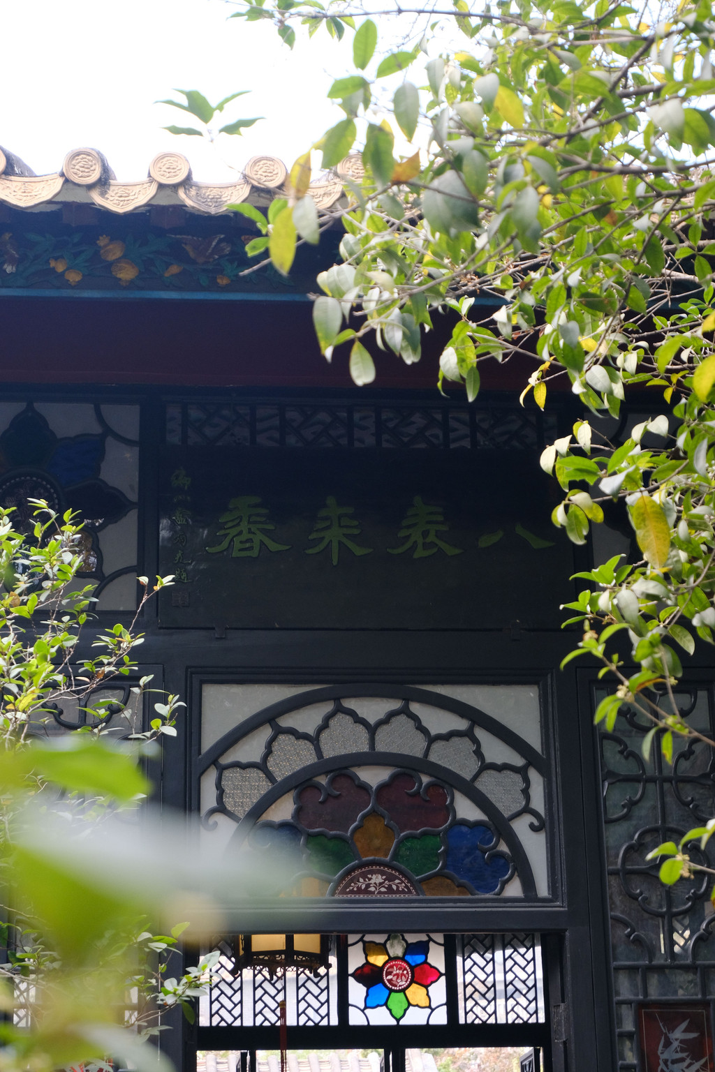 我最喜欢这个园子的有两点,一个是园子里随处可见的“彩绘蚀花金片玻璃”,颜色各异,形态不同,每一块上面都精细的雕刻着各种花纹图案或人物故事,显得格外精美,尤其在阳光的照射下,熠熠生辉,流光溢彩。另一个是园子里种植着各种果树,有杨桃、荔枝、龙眼等,还有开着奇奇怪怪花朵的植物,光是看着那些挂满枝丫的果子,就是一件让人无比愉快的事儿。