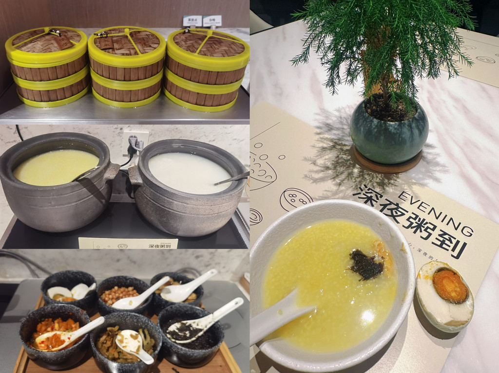 今晚入住的亚朵酒店在21:30-23:00有“深夜粥到”服务,我们很好奇,虽然肚子很饱,也想去体验一下。酒店为住店客人提供了三样点心、白粥和小米粥,以及一些小菜,挺不错,诚意满满。