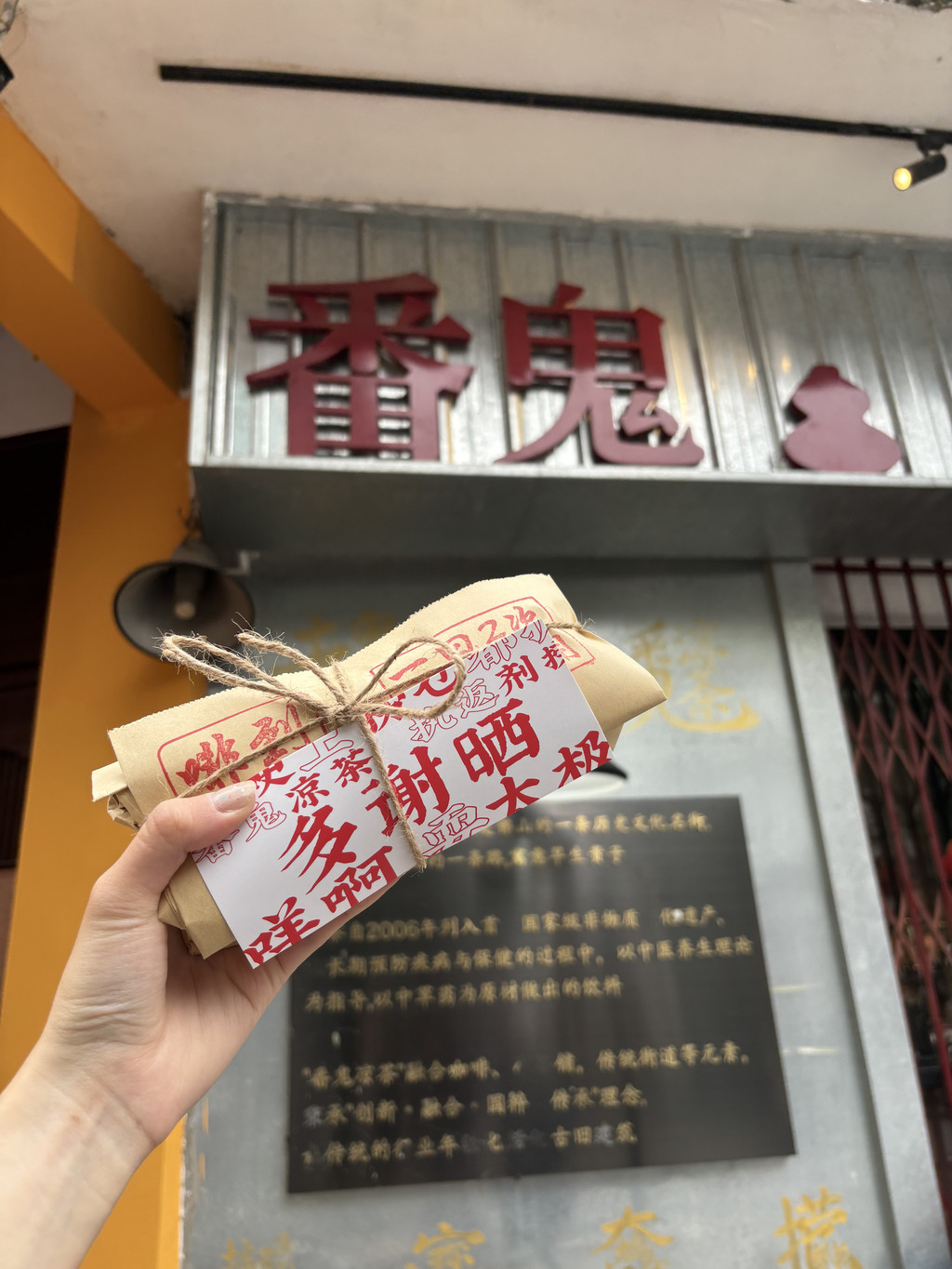 走过快子街,路口有一家番鬼凉茶,挺有意思,进去坐坐,妞买了杯喝的,包装的好好看。
