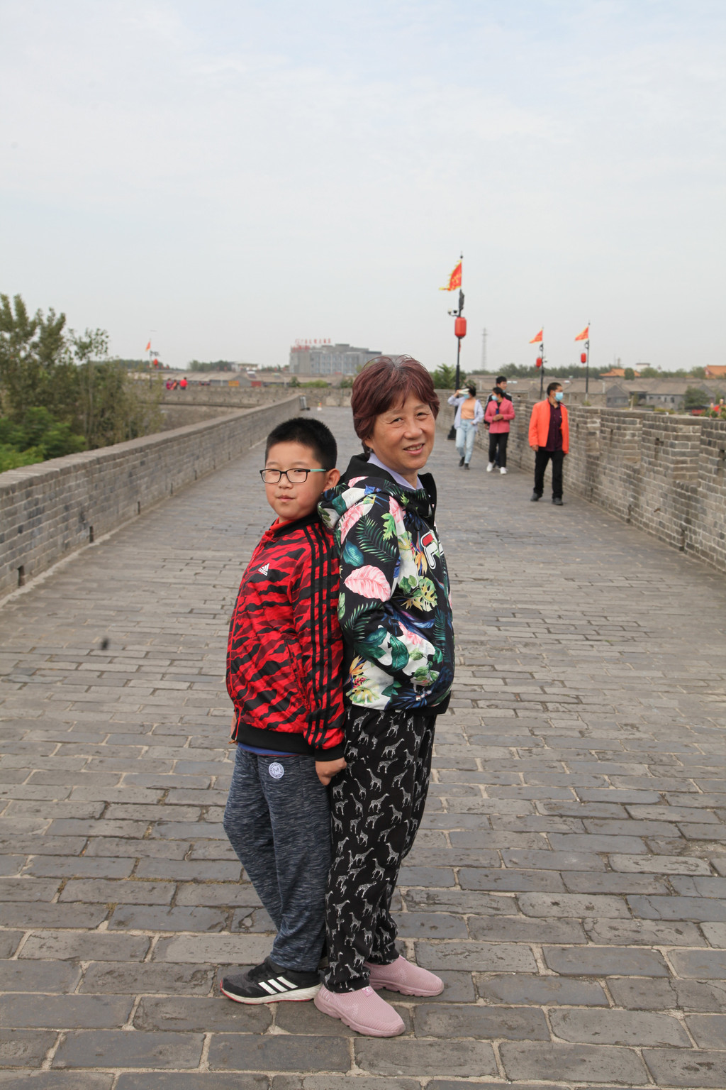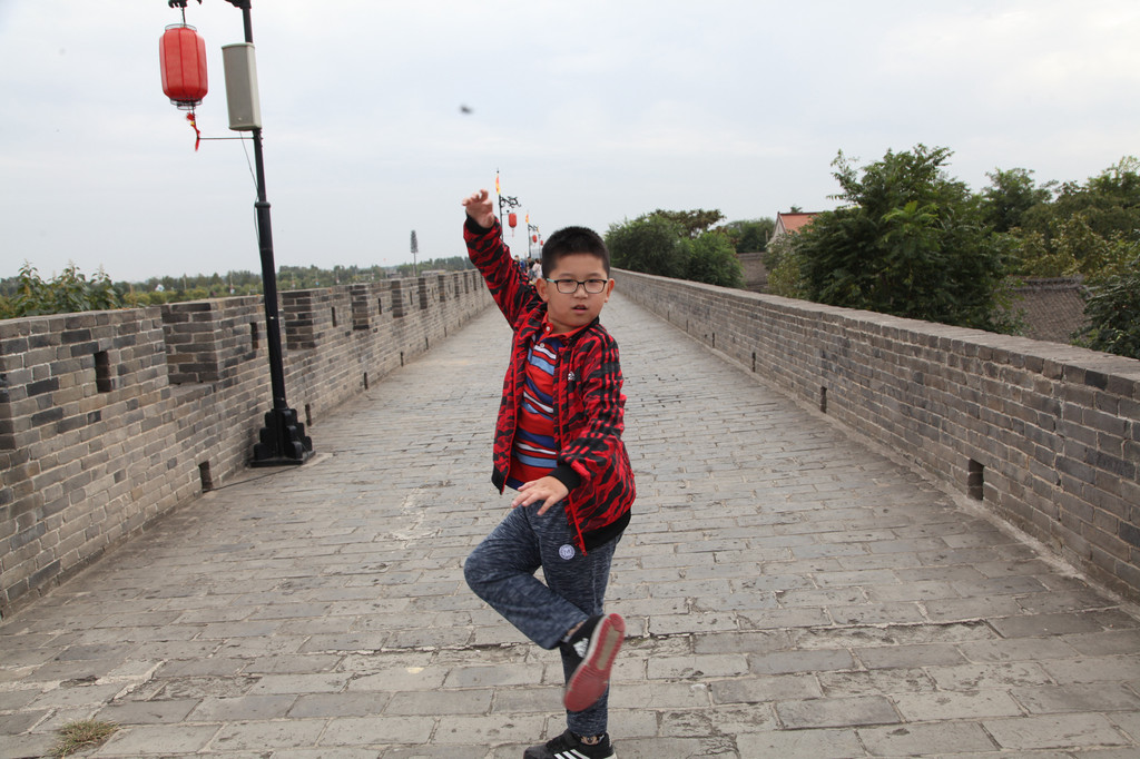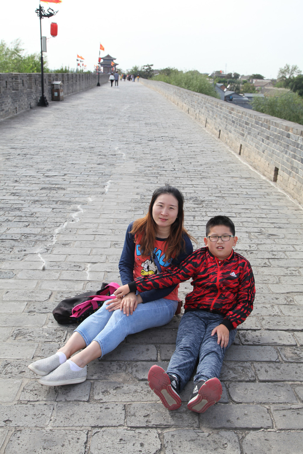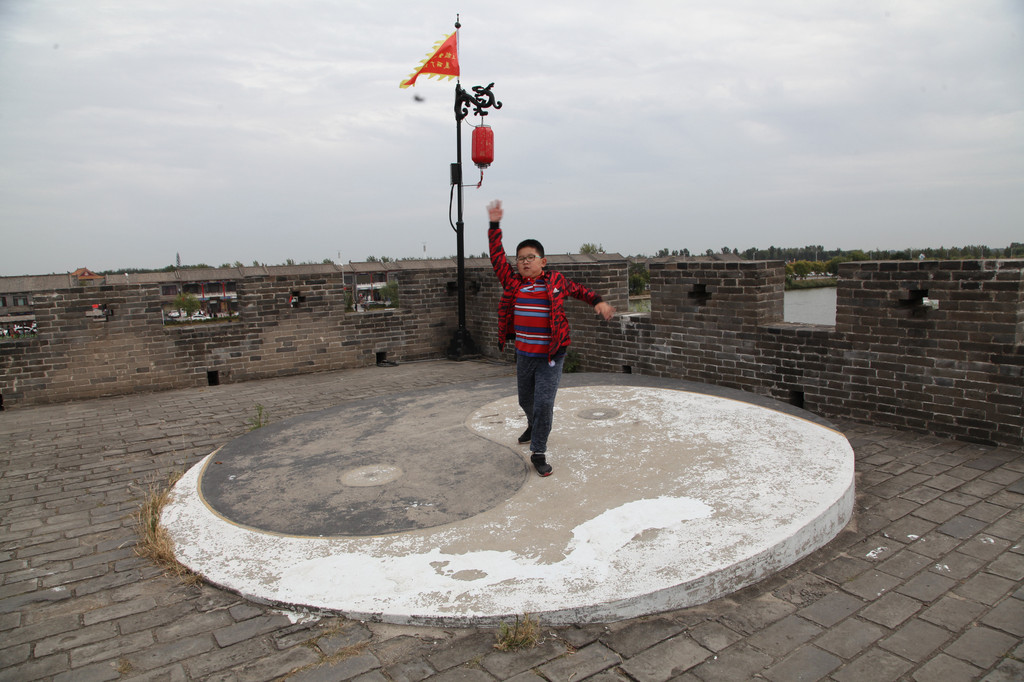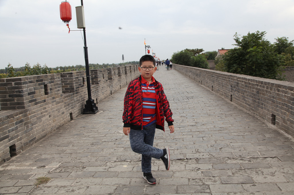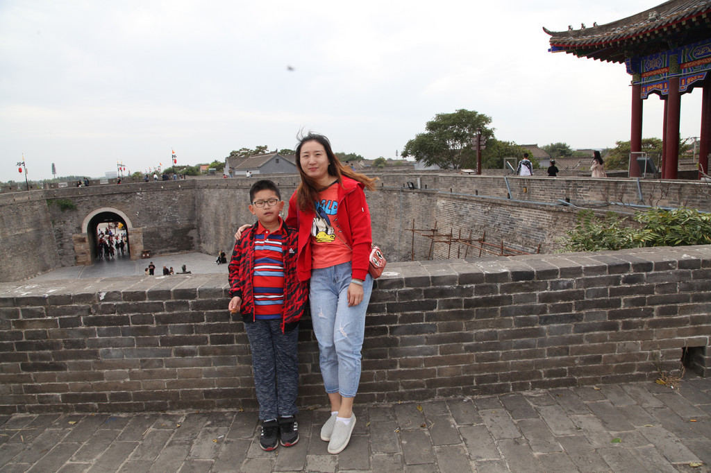 广府古城城墙上,龙太子与妈妈