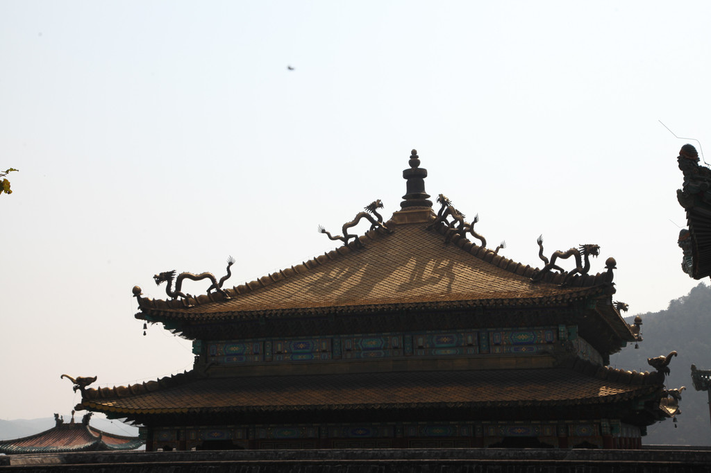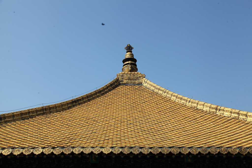 金色的琉璃瓦,表面镀上了一层金箔,结果吸引了日本鬼子的贪婪之心,居然爬上金顶的瓦片,拿着刺刀来刮金瓦片上的薄薄的金箔,想要发财,不料从屋顶摔死两个鬼子,就不敢再刮了,所以底层的金顶瓦片,现在呈暗色,而顶上的金瓦片,已经金黄璀璨