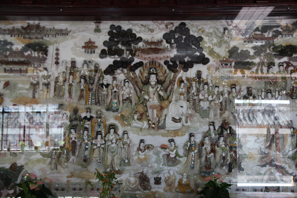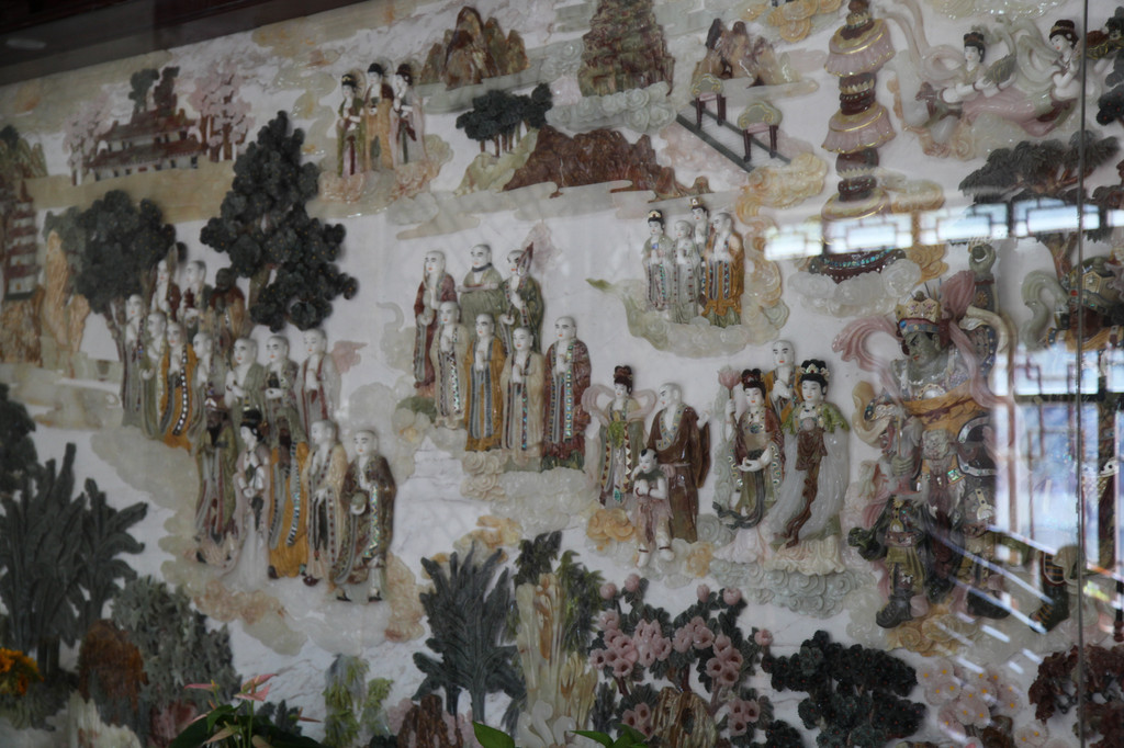 华严阁里,有一块硕大的玉石雕刻成的壁画,反映《华严经》佛教故事的内容