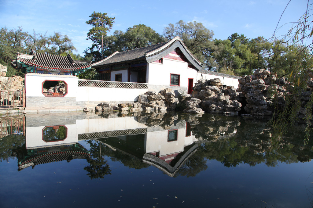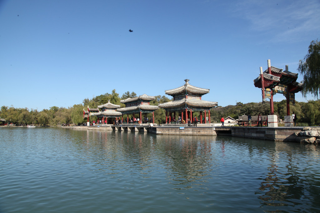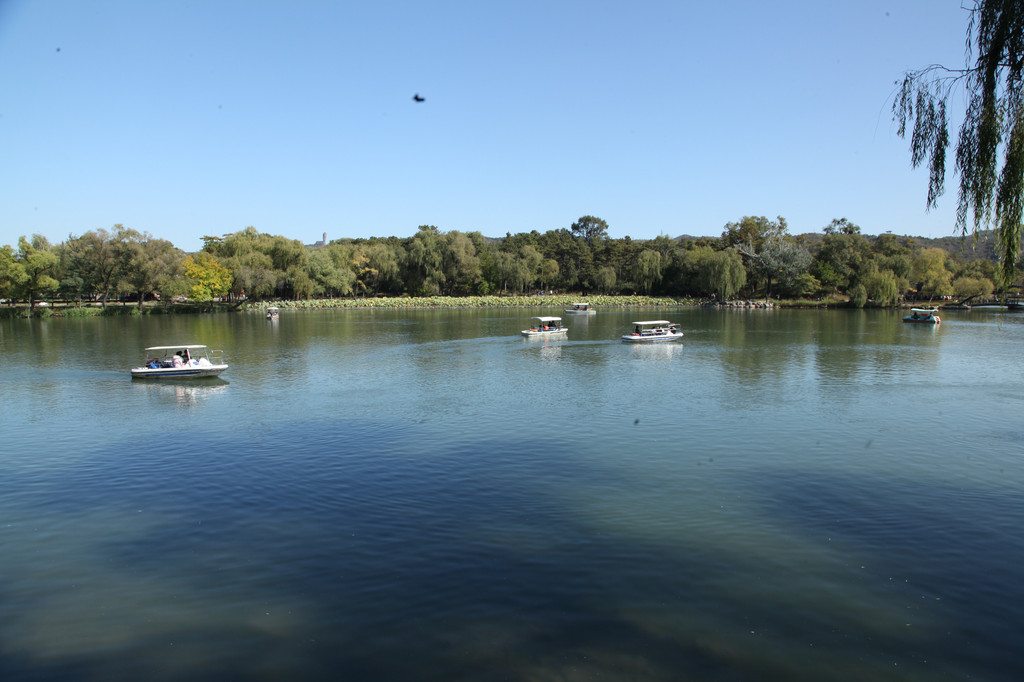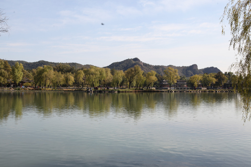 承德避暑山庄的湖景,杨柳依依,婀娜摇曳,给人秀丽恬静的美感