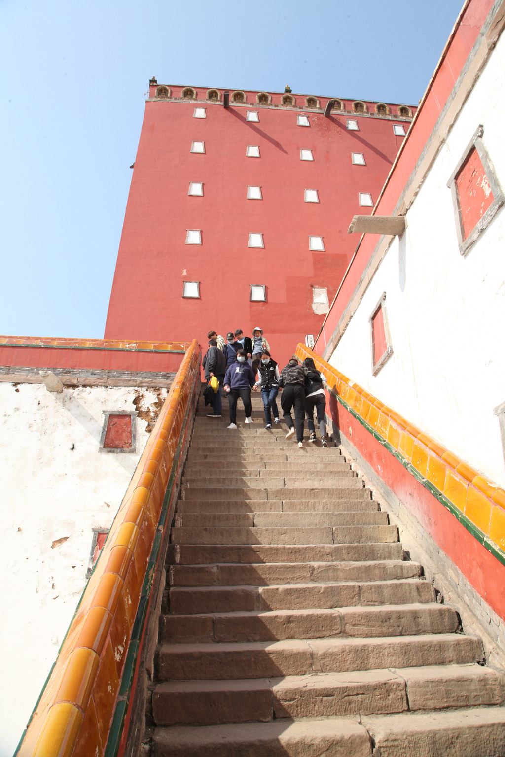 登顶普陀宗乘之庙的石阶梯,石阶很高,须仰视才能看到宫殿,给人以敬畏感