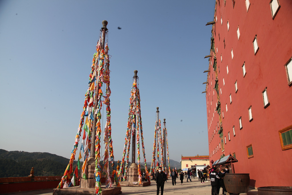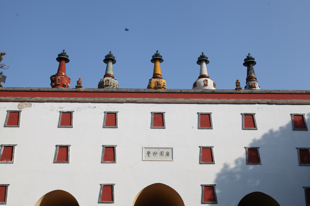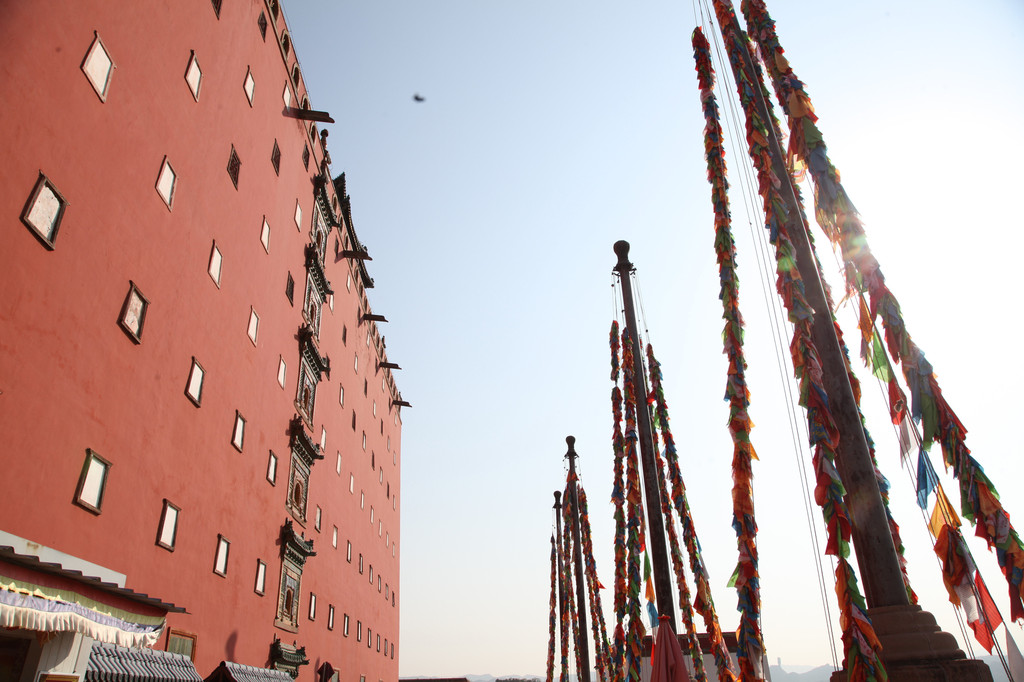 代表藏传佛教五大流派的五色佛塔,安放在寺庙的屋顶上