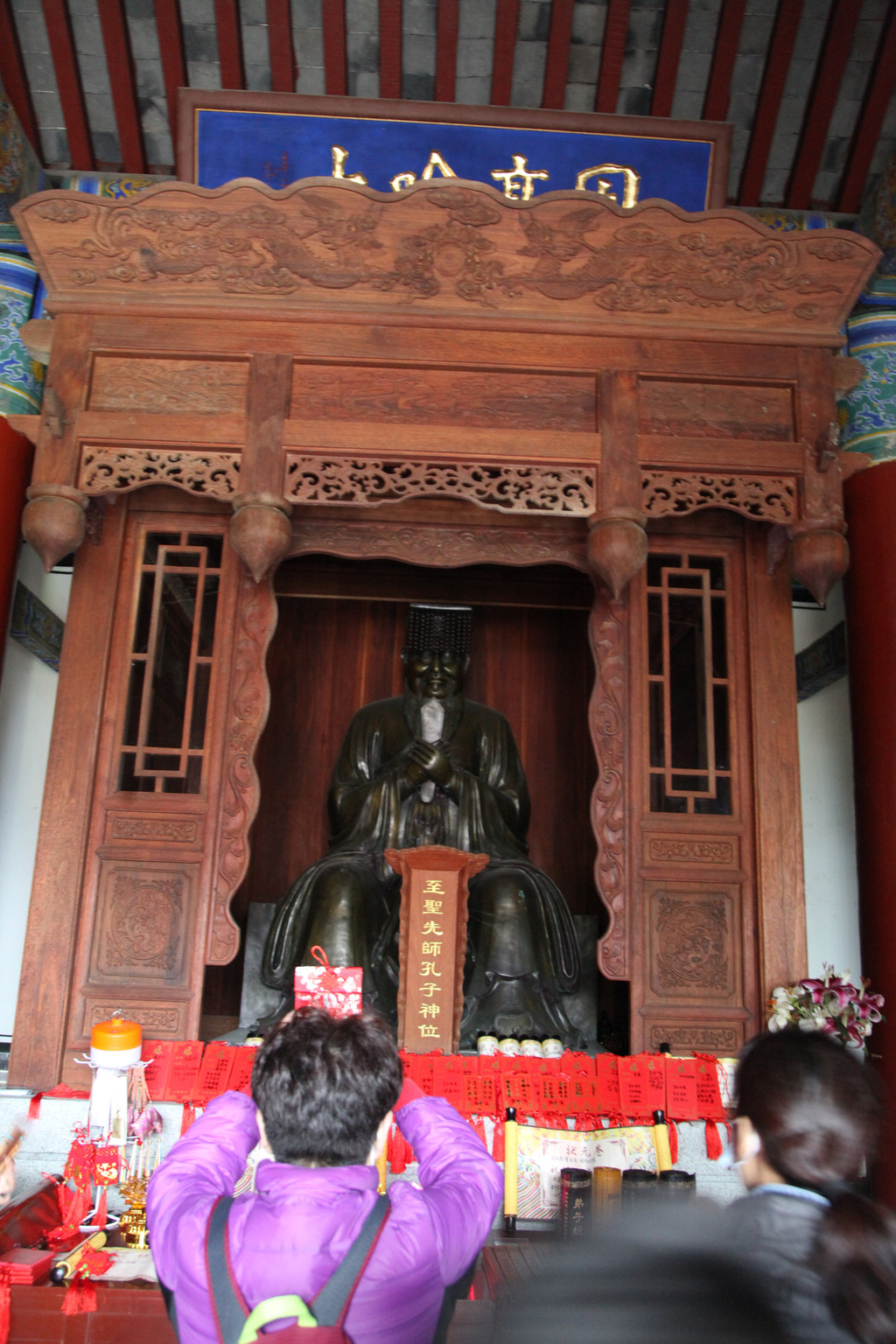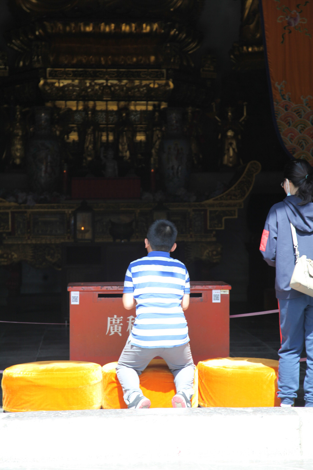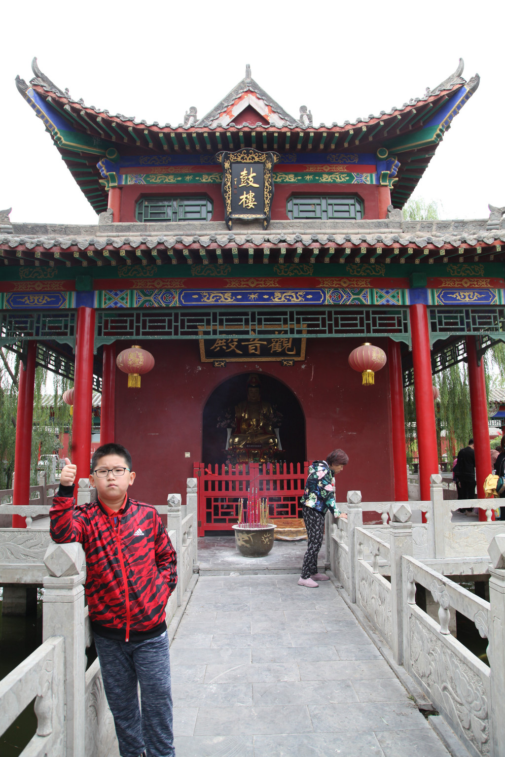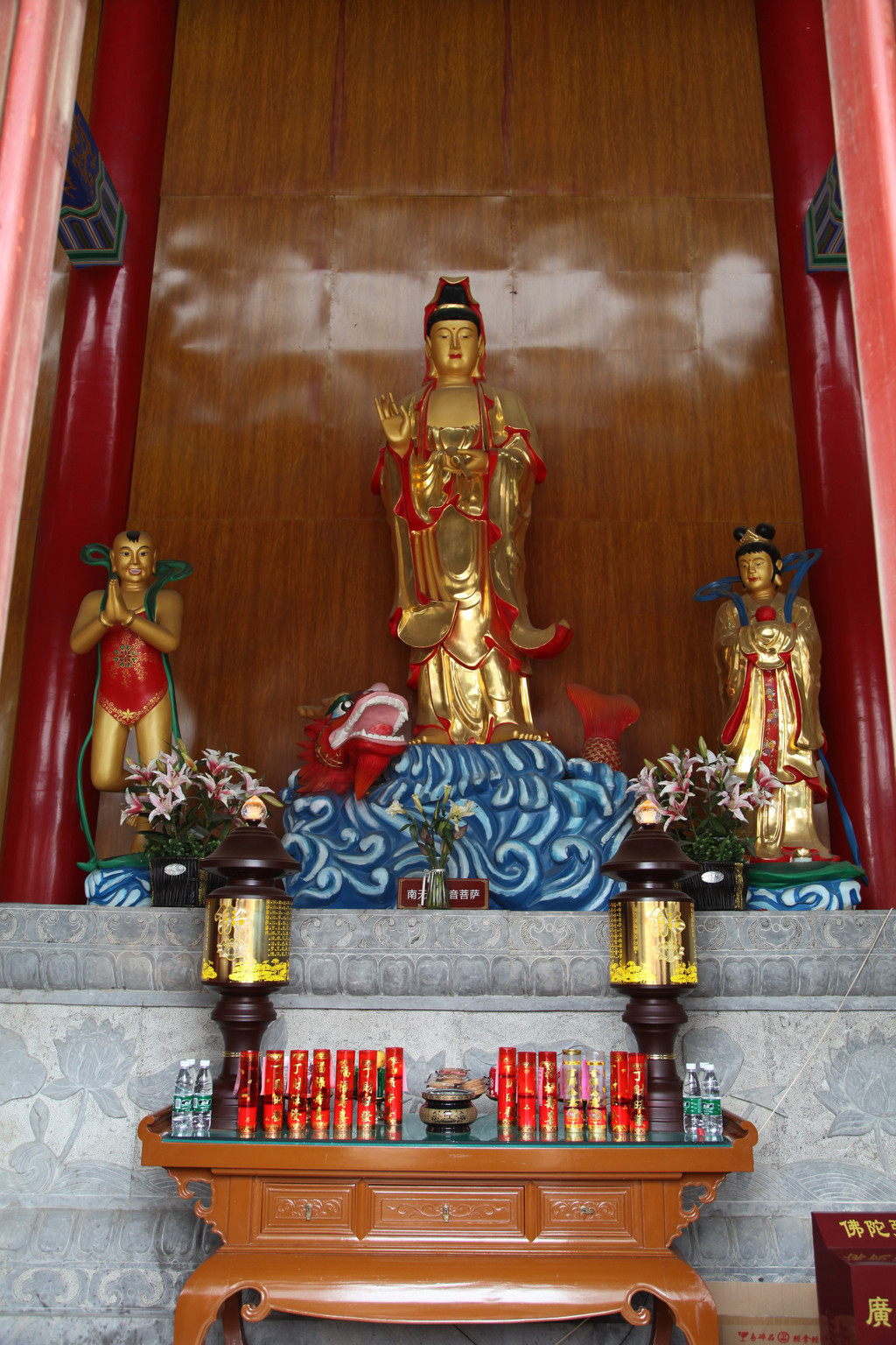 这雕梁画栋的图案,都是300年前康熙皇帝执政期间修缮的,至今一直未予以修缮,原滋原味,富有浓厚的生活气息,龙太子在这里为观音娘娘金身菩萨像贴金箔,祈福祝愿美好前程,工作人员问龙太子贴在哪,龙太子选择的地方别有新意,龙太子说:净瓶。当时,我一愣,怎么会选这么特别的地方贴金箔呢?儿子说,净瓶里装的是圣水,可以给人带来吉祥富贵!阿弥陀佛,善哉善哉!慈恩心愿,福满人间