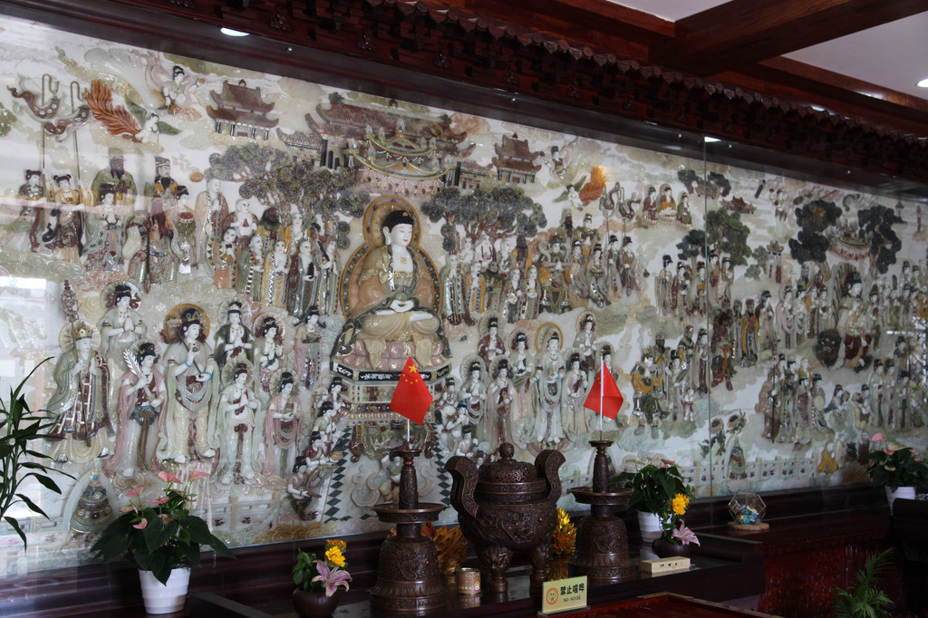 世界上最大的以玉石雕刻成的巨幅华严经故事壁画,幅高约3米,长几十米,全部由玉石真材实料立体雕刻制作完成,弥足珍贵,现存于焦山定慧寺的华严阁中,堪称国宝佳作