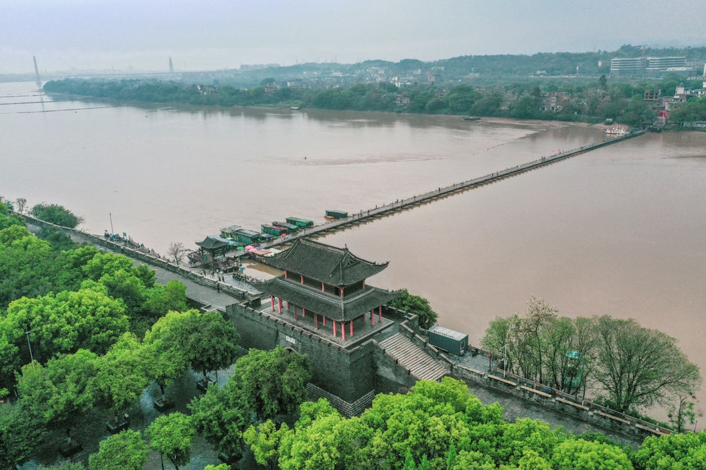 浮桥仍旧用了传统的方式搭建,用船只浮江,搭上木板方便通行。