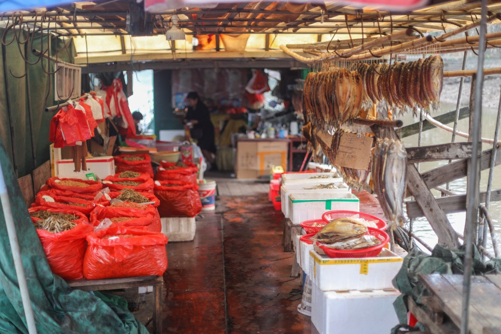 船上生活的渔民仍旧在江上卖他们的渔获等特产,充满了烟火气。