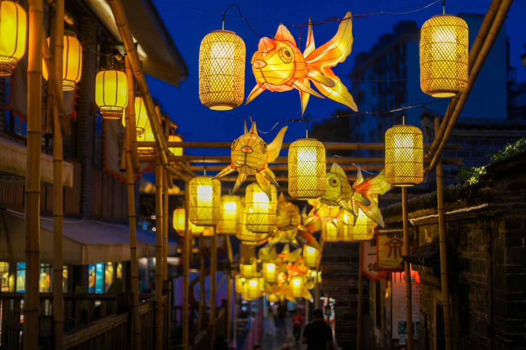 半空的飞龙形彩灯,鲤鱼形彩灯,给靛蓝色的夜空加入了缤纷的色彩。
