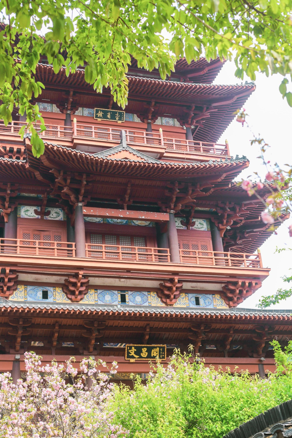 在浅粉色的樱花林中,鲜红色的 文昌 阁更显动人。