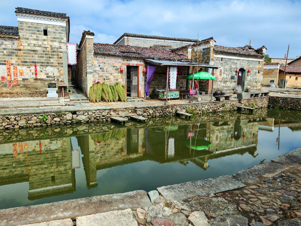 走进村里,“品字三井”格外引人注目。这三口井建于康熙、乾隆、道光三朝,外圆内方如铜钱,寓意着经商、为官、做人都要有品德。继续前行,七星伴月塘如诗如画。七口小塘围着一轮“月亮”,像北斗追星,塘边的老樟树,叶子飘落水中,似一句悠然的诗。