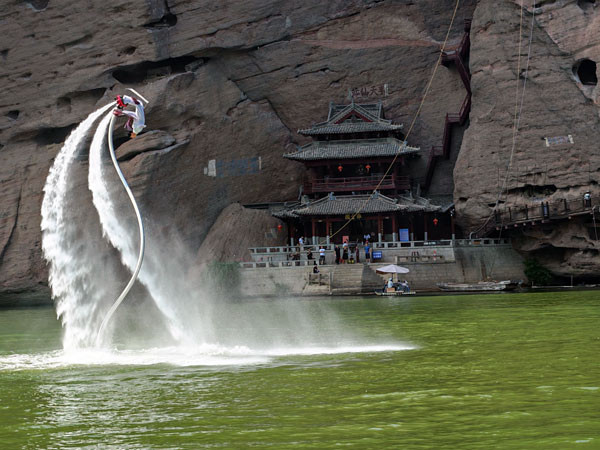 竹筏漂流结束后,前往桃花洲观看悬棺表演。站在泸溪河畔,先是为游客观赏水上飞人表演作为前奏,之后就是悬棺。首游龙虎山时,我也是因时间所限,未能观赏到悬棺表演,此次二登龙虎山终于得以一观。