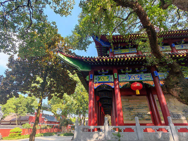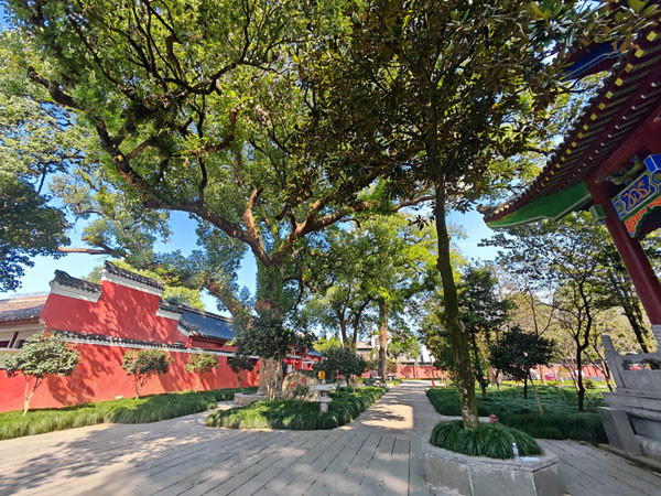 走进天师府,只见院内古柏参天,树干需两人合抱,斑驳的树皮刻满年轮,相传为明代所植,数百年来静静守护着这片圣地。阳光透过枝叶缝隙,在青石板上投下细碎光影,偶有清风拂过,树影摇晃,与屋檐下的铜铃共鸣,叮咚声里,尘世的喧嚣瞬间被隔绝在外。