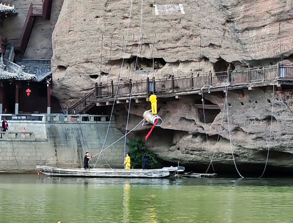 悬棺升至洞口高度时,洞内表演者伸出短索牵引,地面众人则默契地摇晃绳索。在棺木左右晃荡的惯性中,上下合力精准将其送入岩洞,整套动作行云流水,仿佛穿越回春秋战国时期的丧葬现场。后来才知,这些表演者多是当地擅长攀岩的药农后代,他们的演绎既还原了“滑轮绞车吊装”的推测,也融入了古越人采药、渔猎的生活印记 。