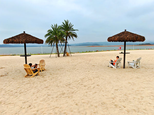 我们结束了萌宠岛的观光,乘船回返登岸后回到了万方银滩,这里一公里长的沙滩景象展现在眼前。沙滩上的白沙细软,据说是从厦门运来的。椰子树和棕榈树在风中摇晃,遮阳伞下的沙滩椅上已有游客在休息。