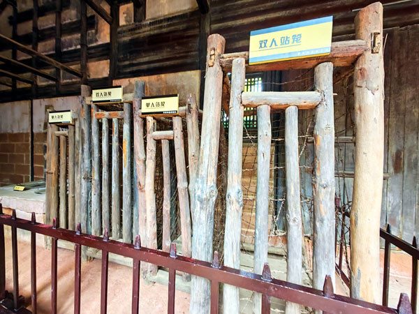 这个站笼体积很小,只够一人在里面站立,而四周却都是露着铁刺的铁丝网,人在里面站立,稍一移动就会被尖锐的铁刺扎伤,可见当时的敌人对革命者采用的手段是相当残忍的。