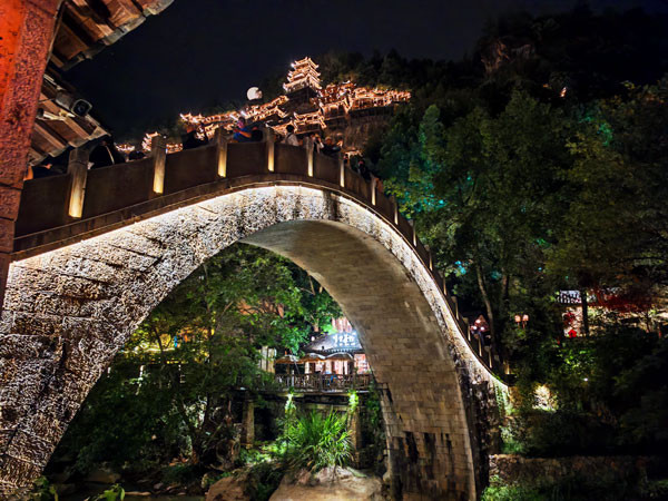 离开瀑布栈道,前往揽月桥。此时,蓝调时刻的天空呈现出一种透透的蓝,桥灯刚亮起来,暖黄的光映在水里,桥拱倒影宛如一轮满月,美得让人窒息。桥上的众多游客纷纷选取各种角度在此留影,呈现出一派热络火爆的景象。