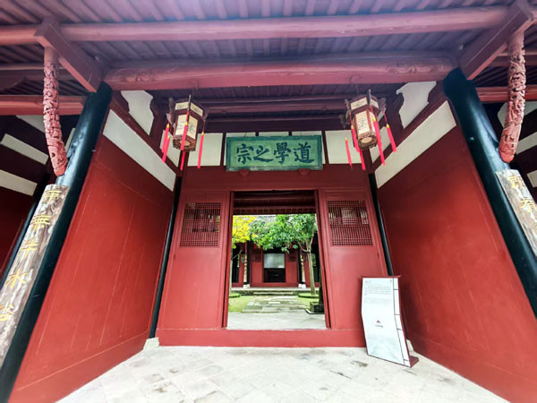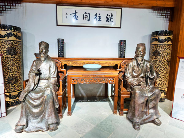 堂内陈设古朴,正中悬挂着“鹅湖之会”的油画,画面上朱熹端坐案前,神情沉稳;陆九渊手持书卷,意气风发,双方弟子环坐四周,或凝神倾听,或若有所思。站在堂中,仿佛能听见当年两位大儒唇枪舌剑、激辩义理的声音,那是关于"格物致知"与"心即理"的思想碰撞,是儒学发展史上的一次重要对话。