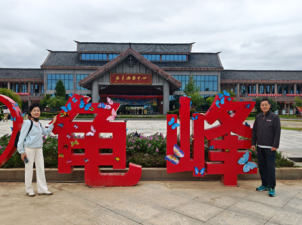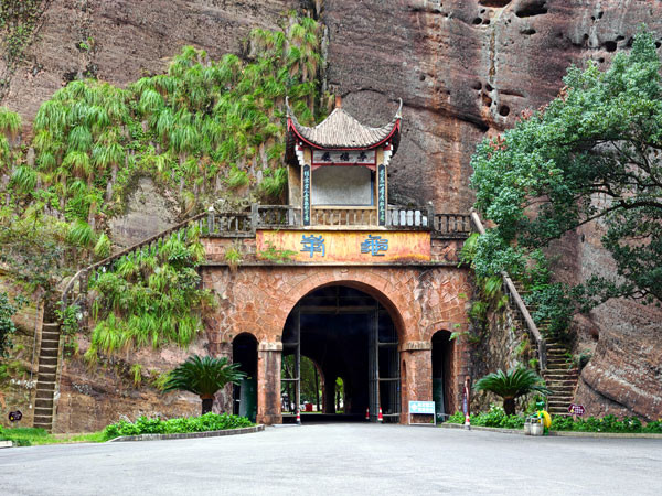 团队到此乘环保观光车进入景区,漫步穿过展旗峰下面的锁春洞,一幅“双龟迎宾”的景观便映入眼帘,两只石龟栩栩如生,仿佛在颔首致意,欢迎我们的到来。沿小径前行,樟树成荫,绿意盎然,清风拂面,送来丝丝凉意,让人顿感心旷神怡。