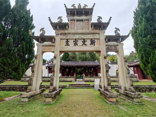 石牌坊上书“斯文宗主”四字,笔力遒劲,熠熠生辉,这是后人对鹅湖书院学术地位的高度赞誉。穿过仪门,便是核心建筑明伦堂,也就是当年朱熹与陆九渊辩论的讲堂。