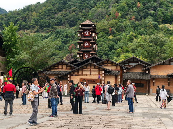 我们走进望仙谷时,夕阳的余晖还未完全褪去,给山谷披上了一层金色的薄纱。顺着人流往瀑布走去,石板路被夕阳晒得暖暖的,偶尔有穿汉服的姑娘提着裙摆轻盈地经过,那衣袂飘动的样子,仿佛让人们穿越到了古代。