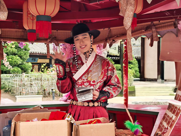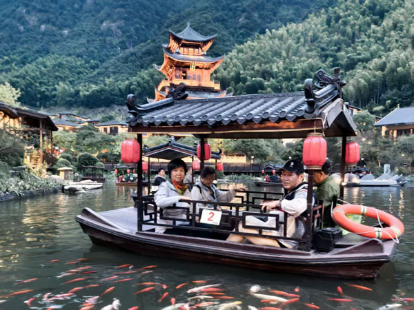 我们从葛仙村众妙阁下面的码头登船,四人为一船,动力为脚踏式,船游太虚幻境,可穿古镇水道而行,两岸阁楼倒映在水中,景色如诗如画。船游其间,游客还可提前准备少量鱼食,投喂跟着船游的锦鲤,欣赏“鱼跃水面+古桥倒影”的美景,拍摄出极具氛围感的照片。登岸后街头会遇见帅气的小哥邀请你做游戏,获胜者赢得银票收获小礼品。