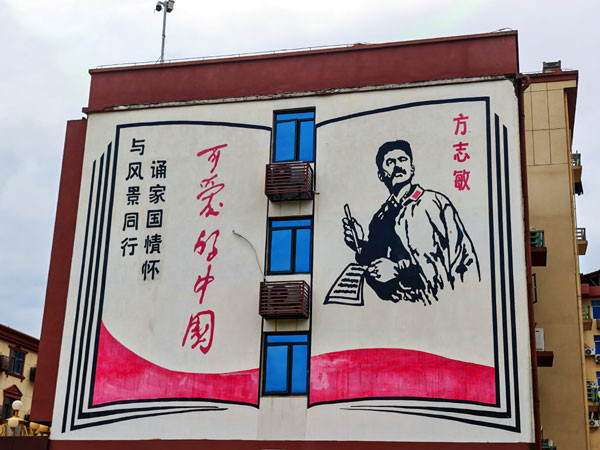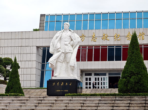 2025年10月21日11时,江西行团队从入住的葛仙村风景区仙村客驿酒店B楼出发,刘雍师傅驱车一个半小时,在领队李伯英与耿和平及导游汪妹剑带领下,来到位于江西弋阳的方志敏纪念馆参观瞻仰。刚到弋阳,就看到了街头建筑物上十分醒目的方志敏烈士的宣传画。