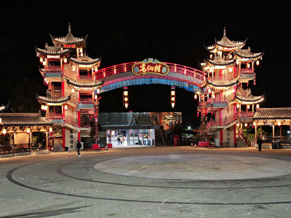 一般来说,葛仙村的夜从“洗尘桥”开始苏醒。这座横跨溪流的古桥,桥身被暖橙灯光勾勒出温婉的弧线,桥下溪水潺潺,倒映着两岸鳞次栉比的仿宋阁楼,飞檐翘角在水中碎成粼粼波光。