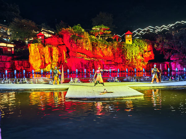 夜幕完全降临后,葛仙村的核心看点——“葛仙归来”实景演出拉开序幕。演出以葛仙山的道教文化和神话传说为蓝本,在“太虚幻境”的水道两岸展开。随着灯光暗下,水面上突然亮起万千星光,岸边的阁楼化作天然舞台,演员们身着古装,在灯光与水雾的映衬下演绎葛玄炼丹、济世救人的故事。灯光时而化作漫天星辰,时而变成熊熊炉火,水雾缭绕中,仿佛真有仙人降临,沉浸式的体验让人忘却现实。
