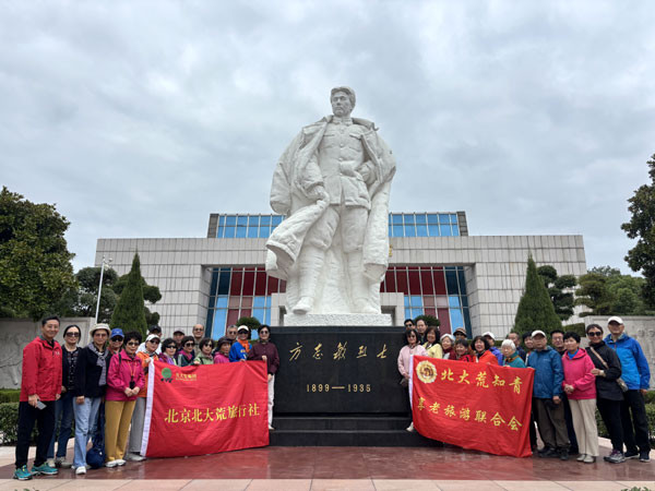 来到方志敏纪念馆前,只见方志敏烈士的雕像巍然矗立。他身着军装,目光坚定地望向远方,仿佛在凝视着他毕生追求的“可爱的中国”。我们在此驻足鞠躬,表达对烈士的崇敬之情。