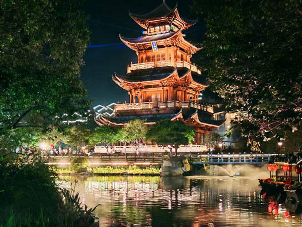夜晚是众妙阁最美的时候,景区通过灯光、3D投影等现代科技手段,为其打造了一场精彩的光影秀。灯光变幻间,展现出道教“天人合一”的意境,同时配有春夏秋冬四季轮回等画面,腾龙、飞凤等图案在阁身上流转,美轮美奂,吸引了众多游客前来观赏拍摄。